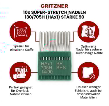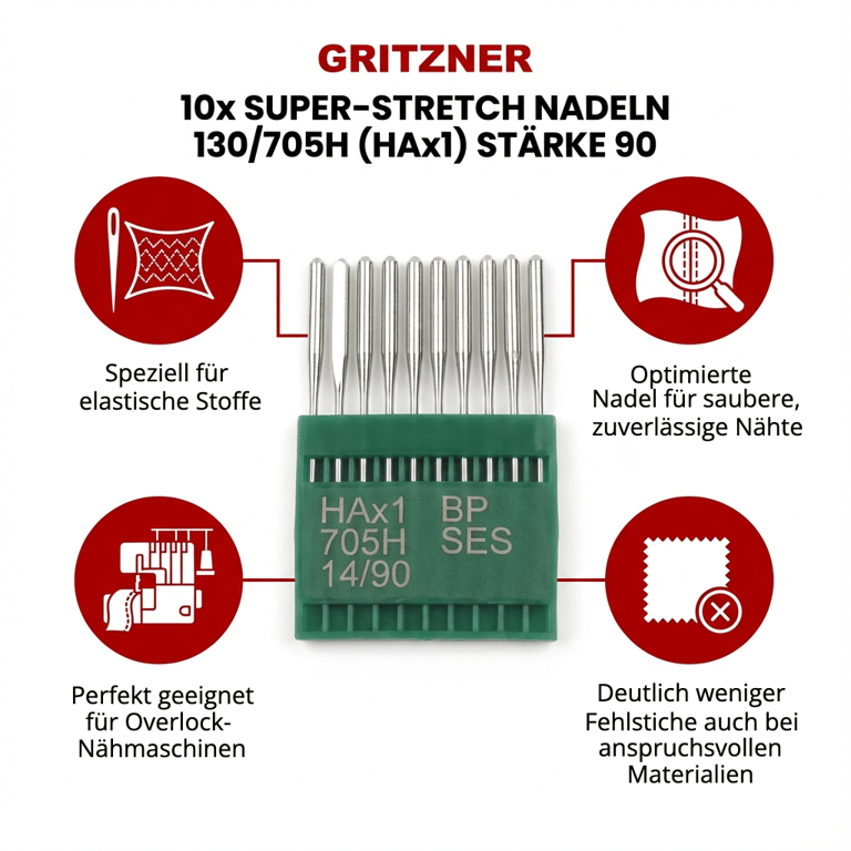 Die Gritzner Super-Stretch Nadeln 130/705H (Stärke 90) sind ideal für elastische Stoffe wie Jersey und Lycra. Sie sorgen für saubere Nähte mit weniger Fehlstichen, sind langlebig und perfekt auf die Gritzner 788 Overlock abgestimmt – eine zuverlässige Wahl für professionelle Ergebnisse bei dehnbaren Materialien.
